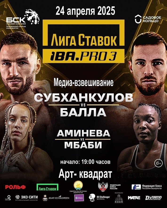 Официальная процедура взвешивания участников вечера пройдет 24 апреля в 19:00 в культурном центре «Арт-квадрат» (вход со стороны ул. Чернышевского). В одном из главных поединков вечера многократный призер чемпионата России по боксу Артур Субханкулов в 10-раундовом бою встретится с австралийцем Ибрагимом Баллом (12+). Победитель получит пояса IBF Intercontinental и WBA Oceania. Иллюстрация предоставлена Минспорта РБ.