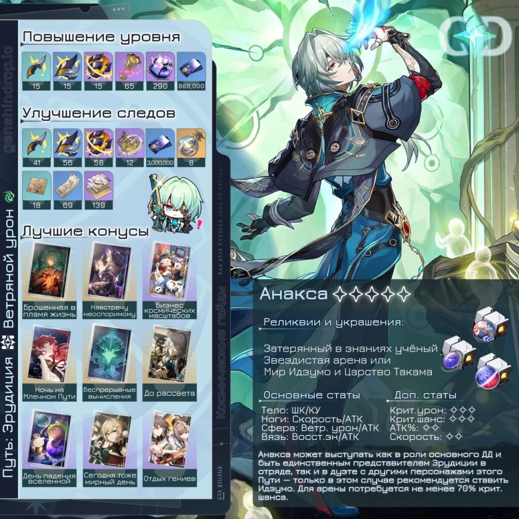 ㅤДля профессора все Эйдолоны будут полезны, однако если вы хотите получить приятные бонусы к урону и комфорту игры, следует остановиться на первых двух — они понизят защиту и упростят наложение уязвимостей на противников. Если же вам хочется максимально раскрыть потенциал Анаксы, как главного дамагера, то стоит стремиться к шестому Эйдолону, чтобы получить оба усиления от его следа и максимизировать его личный урон.