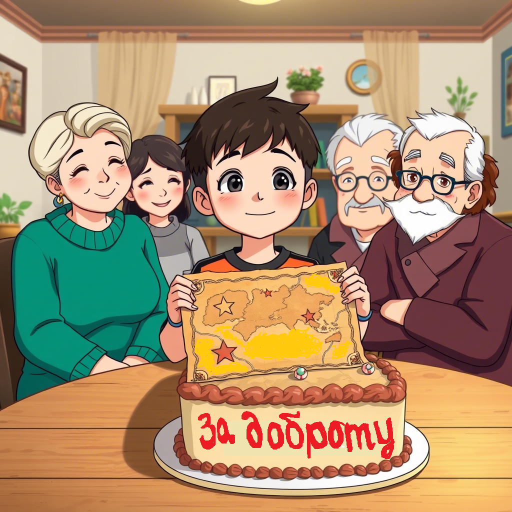 Он открыл дверь и увидел, что вся его семья собралась за столом. На столе стоял красивый торт с надписью: «За доброту!»