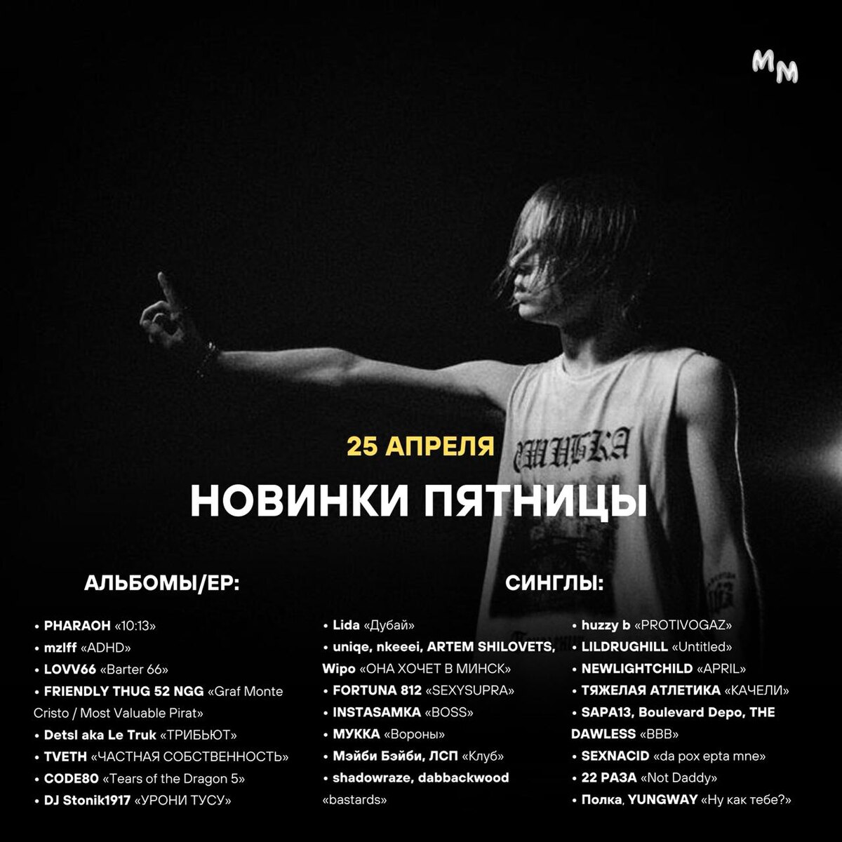🗓 НОВИНКИ ПЯТНИЦЫ — 25 АПРЕЛЯ Альбомы/EP: • PHARAOH «10:13» • mzlff «ADHD» • LOVV66 «Barter 66» • FRIENDLY THUG 52 NGG «Graf Monte Cristo / Most Valuable Pirat» • Detsl aka Le Truk «ТРИБЬЮТ» • TVETH «ЧАСТНАЯ СОБСТВЕННОСТЬ» • CODE80 «Tears of the Dragon 5» • CAPTOWN «CYBERTOWN» • ALMARY «На мятых простынях» • morphineee «BigFamous» • benjamingotbenz «gits 4: flower of life» • Navai «ФРИКОВАЯ ДАМА» • CALLMYDD «Я в этом городе один 2» • DJ Stonik1917 «УРОНИ ТУСУ» • MILDIX «NEURO TRAP» • Устала курить «BALLAST» Синглы: • Lida «Дубай» • uniqe, nkeeei, ARTEM SHILOVETS, Wipo «ОНА ХОЧЕТ В МИНСК» • FORTUNA 812 «SEXYSUPRA» • INSTASAMKA «BOSS» • МУККА «Вороны» • Мэйби Бэйби, ЛСП «Клуб» • ICEGERGERT, SKY RAE «Наследство» • shadowraze, dabbackwood «bastards» • huzzy b «PROTIVOGAZ» • LILDRUGHILL «RELATIONS» • NEWLIGHTCHILD «APRIL» • ТЯЖЕЛАЯ АТЛЕТИКА «КАЧЕЛИ» • SAPA13, Boulevard Depo, THE DAWLESS «ВВВ» • SEXNACID «da pox epta mne» • 22 РАЗА «Not Daddy» • 10AGE, НАРОДНЫЙ СТИЛЬ «Воин» • Thomas Mra