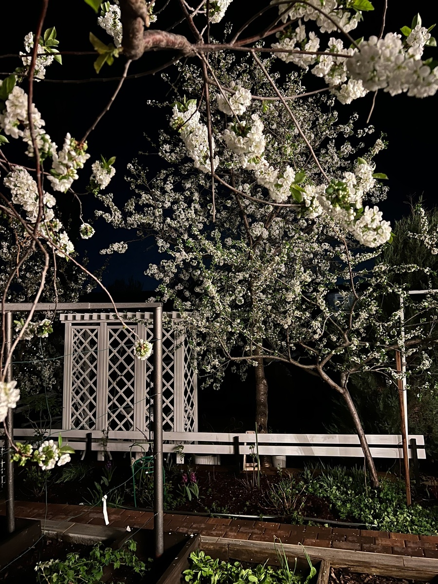 Сегодня ни осталось ни одного дерева, которое бы не цвело. Сад утопает в белой пене. Ночью с освещение сад выглядит таинственным.