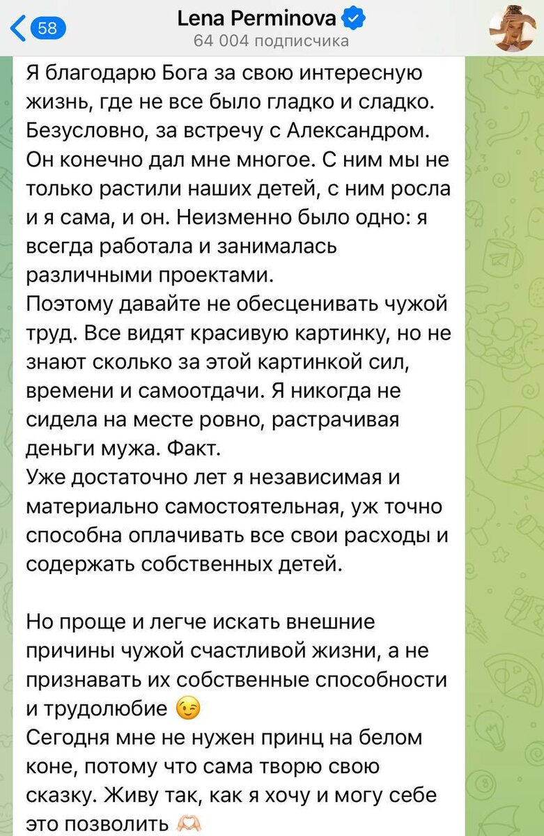 Ну не то чтобы Елена Перминова прям всегда работала. Просто как раз, через четыре года после начала отношений Лены и Лебедева, очень удачно и своевременно изобрели инстаграм (запрещен), и все как-то покатилось само. А вот уже дальше стало необходимо трудиться над возделыванием этой своей прибыльной грядочки. И молодец вообще-то. Да и вообще Лена, Героиня вам рекомендует никому ничего больше не объяснять. Haters gonna hate, как мы знаем.