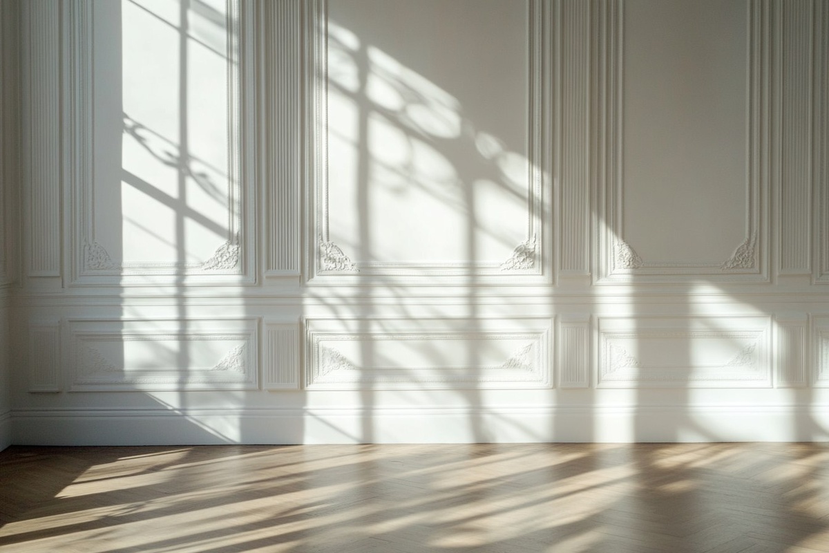 Создано на основе запроса: wall of empty room, white wall, mahogany flooring, sunshine shadows, luxury