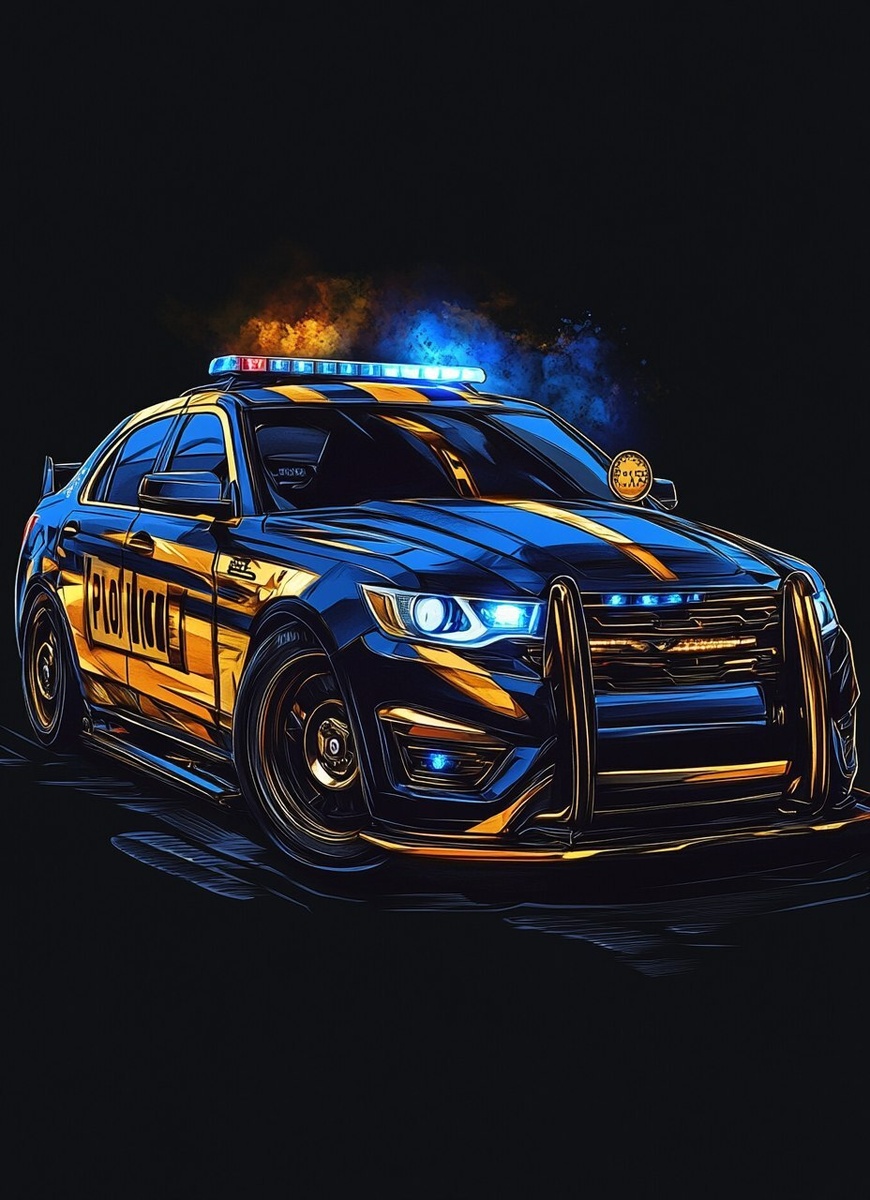 Создано на основе запроса: GOLDEN AND dark blue police car ,DRAWING STYLE,golden and black colors,BLACK BACKGROUND