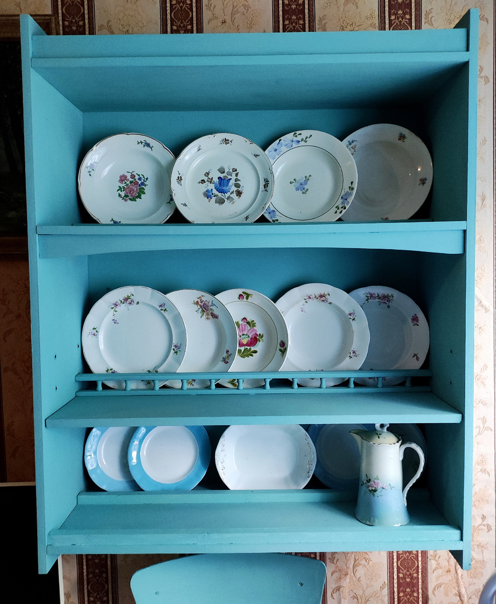 Всем доброго времени суток !!! Я же вчера подвиг совершила, прополола почти все свои клумбы и насадила грядку усов клубники, осенью их не убрала, а весной выбросить жалко. Хоть места не очень много, но маленькую грядку я выделила, ведь клубники много не бывает 😊 Правда утром еле соскребла себя с кровати, трудно после зимы втягиваться в садово-огородные дела. А ещё у меня теперь есть новая полочка под мои фарфоровые сокровища. Ну не совсем так чтобы новая, а собранная мужем из остатков советской мебельной стенки. Вот, всё как мне надо. Хотела я ведь на веранде себе полочку под свои кувшинчики, но потом почему-то захотела именно посудницу под тарелочки и ещё там чего-нибудь, в общем пока так)) На каждой полочке муж прикрутил перекладину, чтобы можно было поставить тарелки, на средней вот такая красивая. На верхней и нижней просто брусочки. Покрасила я её в бирюзо-голубой цвет почему-то захотелось именно такого цвета и очень довольна ) Моя полочка уже обрела своих жителей, а кувшинчики