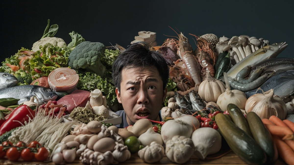 Создано на основе запроса: a realistic photo of a Chinese man frowning at a large pile of various food ingredients, including vegetables