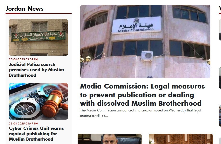 Вот так сейчас выглядят иорданские новости: Полиция проводит обыски в недвижимости Братьев-мусульман Комиссия по СМИ запретила любую публикацию или перепубликацию, связанную с Братьями-мусульманами Подразделение по борьбе с киберпреступностью предупредило о недопустимости публикаций о Братьях-мусульманах в социальных сетях. И это в сводку еще не попала новость об аресте трех видных активистов ХАМАСа.