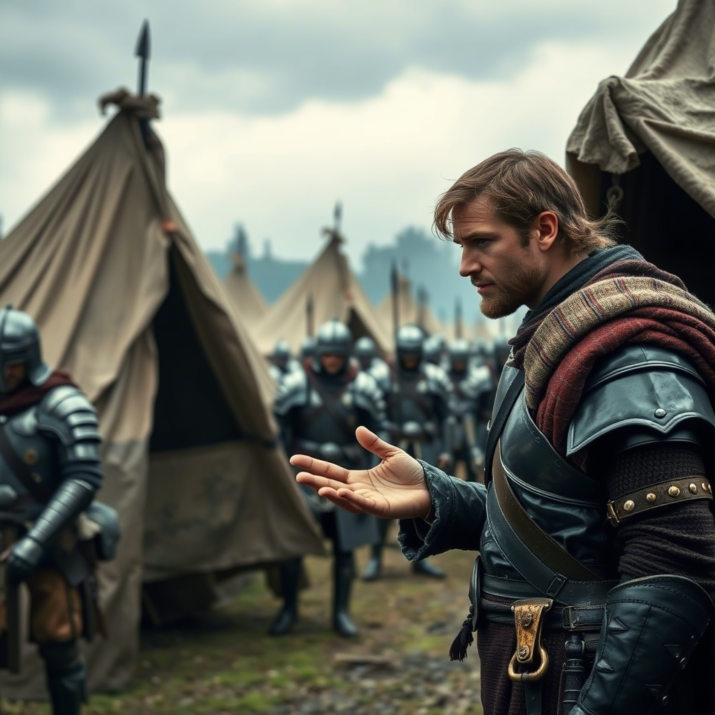 Этого я ждал. Начальник ждал моего одобрительного кивка. — "Я готов. И сегодня." Он и его приближённые рассмеялись. — "Уважаем таких храбрецов. Но — завтра." Командир сказал идти готовиться к завтрашнему дню. — *"У тебя начнутся особые тренировки."* Уже собравшись уходить, я попросил его: — "Командир, извините за дерзость…" — "Да тебе её не занимать. Ну говори уже." — "Вы случаем не знаете, что с лордом Токином?" Его выражение лица резко поменялось — злое, недовольное. — "А тебе какая разница? Ты что, сын его? Так нет. Тебя не должно это волновать." Очень странно… Что за реакция? Меня это насторожило. Возвращаясь в палатку, один из вояк меня предупредил, чтобы я больше не называл имя своего отца — так как его считают предателем, который сдал все позиции и укрытия, и из-за него войска королевства терпят неудачу. Я был обескуражен. "Как это — мой отец и предатель? Никто из лагеря не мог с ним сравниться в силе, доблести и честности." Я был зол.
