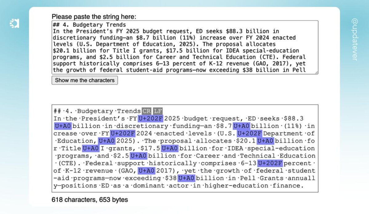 ⚠️Осторожно, подстава! Новые o3 и o4-mini от OpenAI встраивают в тексты невидимые символы (такие как U+202F) похожие на пробелы. Их не заметить среди текста, но текстовые редакторы (вроде Sublime Text и VS Code) легко их выявляют. Таким образом, авторство ИИ будет выявить гораздо легче. ⚡️ Подписаться
