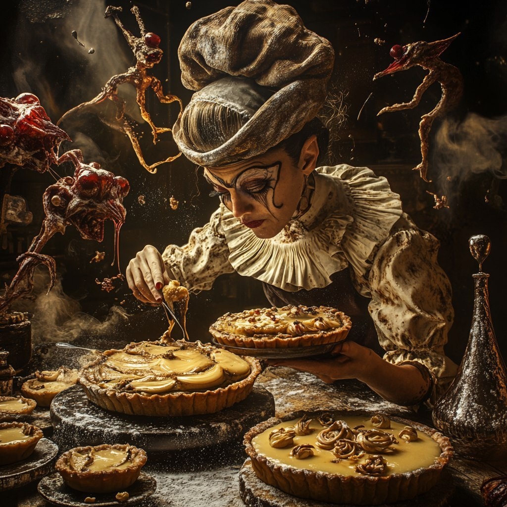Создано на основе запроса: Surreal scene: a person confidently baking custard tarts using bizarre, brown, surreal ingredients thrown by