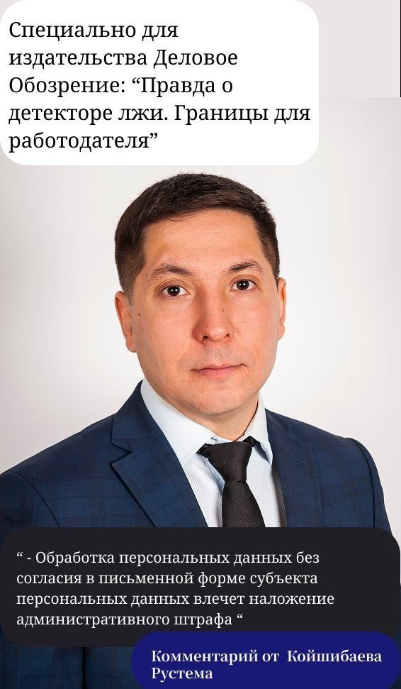 🔥Полиграф на работе: можно ли отказаться и что грозит работодателю?🔥 Для специальной статьи журнала “Деловое обозрение” Рустем Койшибаев рассказал всю правду о детекторе лжи. Все чаще работодатели используют полиграф при приеме на работу или для проверки действующих сотрудников. Но далеко не все знают, что использование полиграфа строго регулируется законом, и принудить пройти такую проверку — нельзя. 📌 Что важно знать? 🔷 Полиграф — это не доказательство лжи, а лишь фиксатор физиологического стресса. 🔷 Его результаты не являются юридически значимыми и не могут быть основанием для увольнения или отказа в трудоустройстве. 🔷 Проведение возможно только с письменного согласия работника или кандидата. 🛡 Перед исследованием работодатель обязан: ✅ разъяснить право отказаться от прохождения; ✅ ознакомить с перечнем вопросов и целями исследования; ✅ не включать вопросы о религии, здоровье, личной жизни, взглядах и т.п. 🤫 Результаты полиграфа — это персональные данные: ⚫️ Их запрещено
