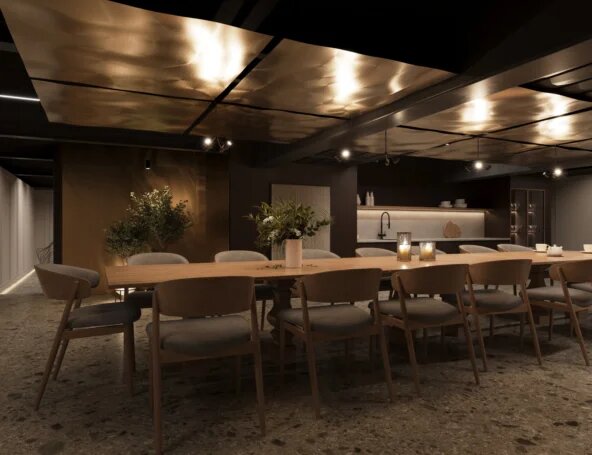 Основная идея дизайн-проекта заключается в создании интерьера lounge-зоны офисной резиденции для проведения деловых переговоров на Тверской, который подчеркивает сдержанность и одновременно притягивает внимание за счет деталей, добавляющих визуальную глубину и изысканность. Центральным элементом пространства стал стол, выполненный из натурального дерева. Он привнес в интерьер теплоту и естественность. Над столом разместили латунные листы, которые не только выполняют декоративную функцию, но и создают уникальную игру света. В сочетании с подвесными светильниками они формируют динамичные блики и отражения. Тем самым, становясь точкой притяжения, добавляя интерьеру выразительности. Цветовая палитра проекта выдержана в нейтральных тонах: глубокие оттенки серого, бежевого и черного создают строгий, но уютный фон. Латунные акценты, перекликающиеся с металлическими элементами в мебели и светильниках, добавляют интерьеру благородства и завершенности. Этот дизайн-проект — воплощение элегантной