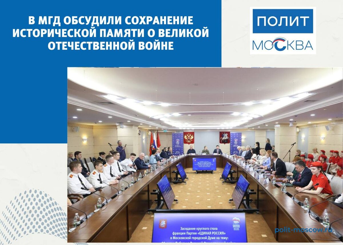 В МГД обсудили сохранение исторической памяти о Великой Отечественной войне В Мосгордуме фракция «Единая Россия» провела круглый стол, посвященный 80-летию Победы. Обсуждались вопросы патриотического воспитания и роль культуры в сохранении исторической правды. Особым гостем стал ветеран ВОВ Тамерлан Барагунов, чья история тронула всех участников. «Сохранение исторической памяти - наш долг перед героями прошлого и будущими поколениями», - рассказала депутат МГД Людмила Стебенкова. По итогам предложены новые пути укрепления связи поколений и анонсированы мероприятия к юбилею Победы.