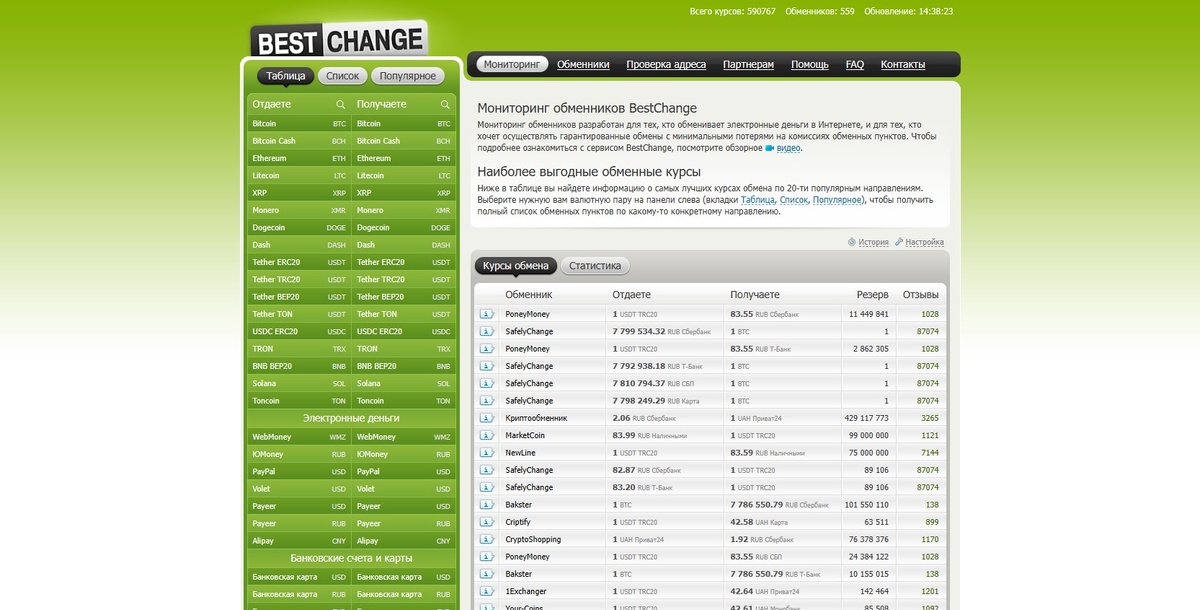 Сегодня мы рассмотрим такой онлайн ресурс, как Bestchange (не работает без VPN с марта 2025 ). Данный проект вобрал в себя сотни проверенный онлайн обменных пунктов, позволяющих обменивать как криптовалюты, так и привычные всем доллары и евро и тд.