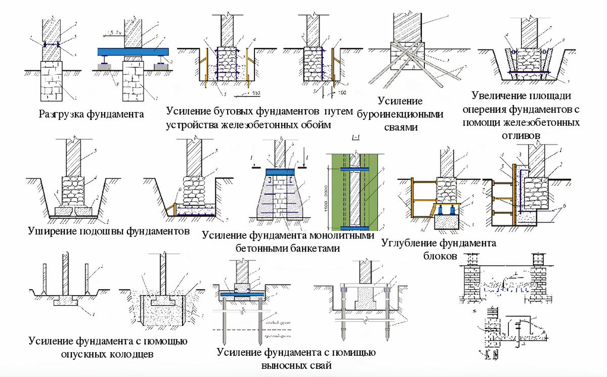 Основные способы усиления тела фундамента: