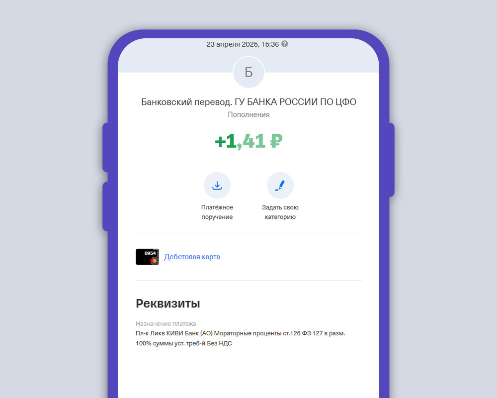 Кажется, это становится традицией — КИВИ Банк (вообще уже не сам банк, а Агентство по страхованию вкладов (АСВ), действующее в качестве ликвидатора) снова тихо перечислил деньги, и снова без уведомлений. Платёж я обнаружил совершенно случайно, а назначение платежа поначалу поставило меня в тупик: «Пл-к Ликв КИВИ Банк (АО) Мораторные проценты ст.126 ФЗ 127 в разм. 100% суммы уст. треб-й Без НДС» Если перевести с «ликвидационного» языка на человеческий, это значит: мне выплатили проценты за то, что управляющий, занимающийся ликвидацией банка, долго не мог рассчитаться с долгами. Мораторные проценты — это компенсация кредиторам за время, в течение которого банк находился под мораторием на удовлетворение требований. Проще говоря, пока суд и АСВ разбирались, как именно банкротить КИВИ Банк, наши деньги были заморожены — и за это теперь платят сверху. Это предусмотрено статьёй 126 закона о банкротстве (ФЗ № 127), и сумма начисляется в размере 100% от моего требования, внесённого в реестр. В