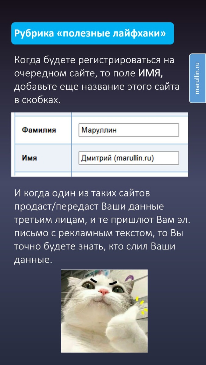 Сегодня рубрика «Полезные лайфхаки» 1) Кто сливает мои данные третьим лицам? Когда будете регистрироваться на очередном сайте, то поле ИМЯ, добавьте еще название этого сайта в скобках. И когда один из таких сайтов продаст/передаст Ваши данные третьим лицам, и те пришлют Вам эл. письмо с рекламным текстом, то Вы точно будете знать, кто слил Ваши данные. 2) Цифровое забвение Мало кто из нас, удаляет свои учетные записи с сайтов, которыми мы уже не пользуемся. По-хорошему, таких учеток у нас не должно быть вообще. Нам еще предстоит выработать такое правило цифровой гигиены. Последствия взлома учетки могут быть разные, но всегда негативные. Если на сайте нет функции удаления учетной записи, то можно написать администрации письмо с примерно таким текстом: «После регистрации на вашем сайте мне стали приходить подозрительные звонки и письма. На основе права на Цифровое забвение, прошу удалить любое упоминание обо мне на вашем сайте и дать письменный ответ … » У больших ребят есть специальн