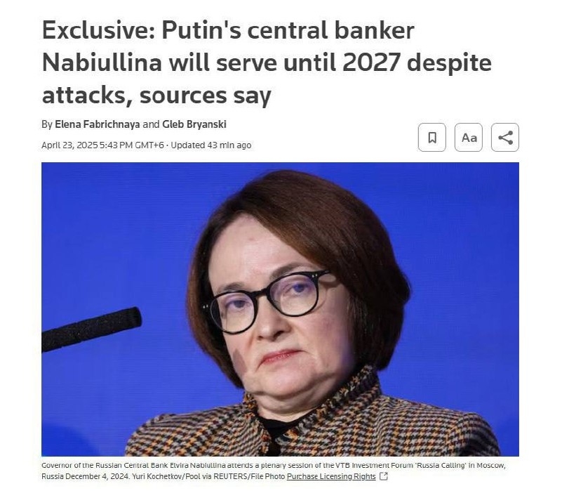 Глава Центробанка Эльвира Набиуллина сохранит свой пост до окончания срока полномочий в 2027 году, несмотря на критику со стороны некоторых известных бизнесменов и депутатов Госдумы, сообщили Reuters два высокопоставленных источника.