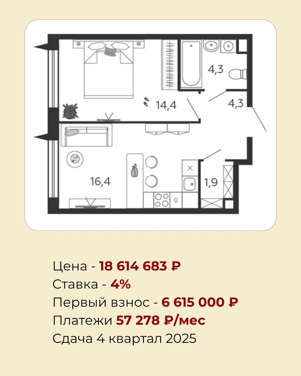 Друзья, шикарный лот в студию! Квартира в Даниловском районе в ЖК Бизнес-класса со скидкой 30% и ставкой 4% по семейке: ✔️ Просторная планировка площадью 41,3 кв.м. ✔️ Надежный застройщик ✔️ Цена со скидкой 30% — 18,6 млн НО, самое главное: лот штучный, 4 квартиры могут уйти уже сегодня — такие предложения долго не висят. Подобных квартир в этой же локации нет. Объекты с меньшей площадью стоят дороже на 4,5 млн рублей, со ставкой 6% по ипотеке Сравниваем 2 квартиры в соседних ЖК: * 41,3 кв.м против 36,3 кв.м. * уровень застройщика ниже, а цена выше на 4,5 млн — 23,1 млн * ставка по ипотеке — 4% против 6% * переплата по процентам на 5,6 млн меньше Общая выгода (цена + переплата по процентам) — 10 млн руб Разница очевидна! На одном пятачке — такие разные условия. Всего 4 квартиры, и они долго не задержатся Чтобы забронировать эту квартиру или подобрать другие варианты, пишите https://clck.ru/3Ga84x