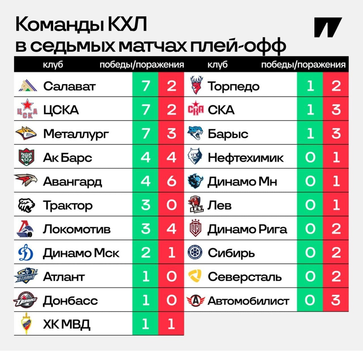 💚🔴 Если верить статистике, то «Салават» точно знает, как в ПО побеждать в седьмых матчах – а вот у «Спартака» такого опыта еще не было