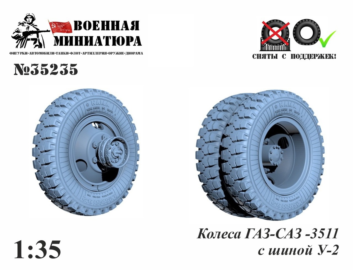 Ставропольская "Военная миниатюра" выпустила на 3D-принтере колеса с шинами У-2 для моделей ГАЗ- САЗ 3511 и аналогичный набор для создания колоритного колхозного тюнинга - с колпаком на задней оси в масштабе 1/35. Также выпущены колеса с шинами Я-307 для моделей экскаватора ЭО-3322 в масштабах 1/35 и 1/25 (бумага).
