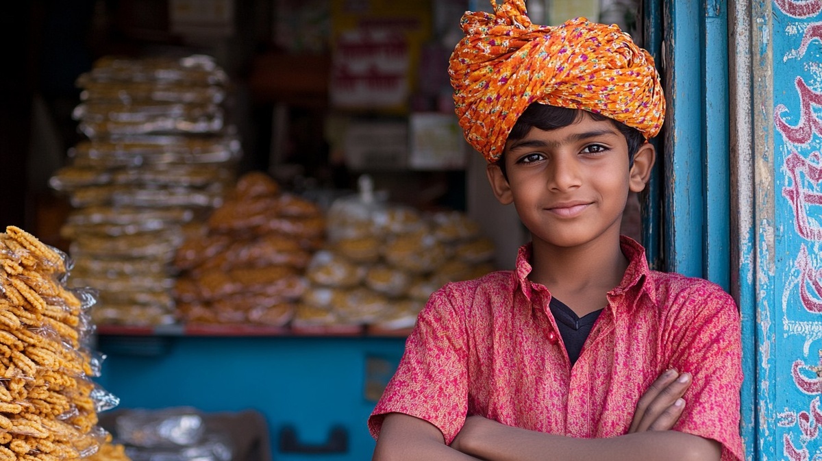 Создано на основе запроса: a rajasthani 16 year old boy wearing rajasthani dress, he is branding genius for selling indian sev snacks