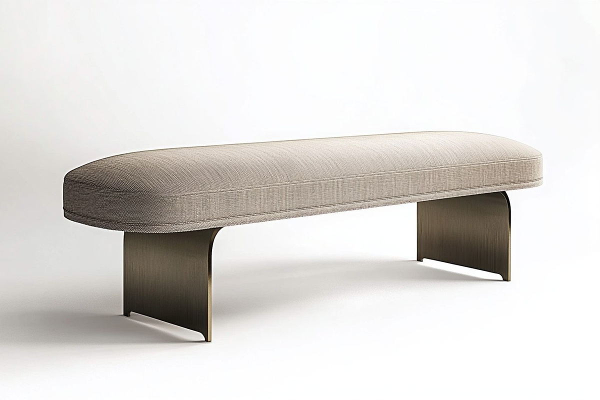 Создано на основе запроса: minimalist beige fabric matte leather bench, linear, yltra luxe, with very dark brass legs that are curved, white