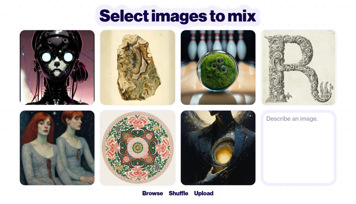 🎨 Splicer — это главный инструмент в Artbreeder, который позволяет создавать уникальные изображения на основе «генетики» других картинок. Он работает как миксер: берёшь несколько исходников, смешиваешь их, настраиваешь — и получаешь нового персонажа, лицо или арт. Но как этим пользоваться, если интерфейс на английском и всё кажется магией? Разбираемся 👇 🔷 Сетка из 8 изображений — это базовые «родители», из которых вы можете начать. Это не финал — просто стартовая подборка. 🔲 Справа — поле Describe an image. Сюда можно вписать промт на английском, чтобы сгенерировать образ по описанию. 🔘 Внизу — кнопки: · Browse — выбрать изображения из базы Artbreeder · Shuffle — случайно обновить подборку · Upload — загрузить своё изображение (в платной версии) Кликните на 1–5 изображений. Это будет визуальная основа — то, что Splicer «скрестит» в новом образе.