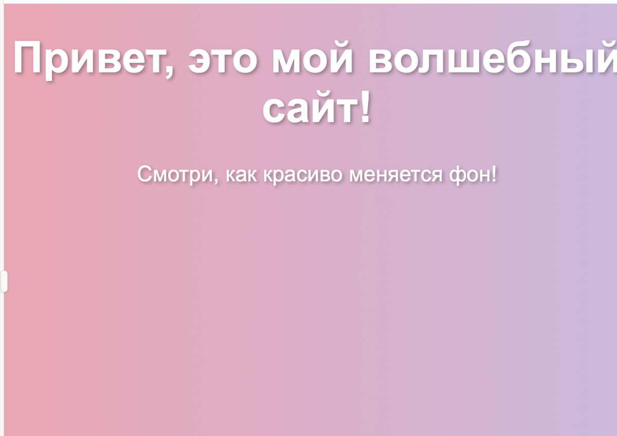 Привет, юные программисты! 🌈 Сегодня я покажу вам настоящее цифровое волшебство — как создать красивый переливающийся фон для вашего сайта, который будет плавно менять цвета, словно радуга или северное сияние! Это супер просто, и вам не понадобятся никакие сложные программы — только базовые знания HTML и CSS. Сначала создадим самую простую веб-страницу. Это как чистый лист бумаги, на котором мы будем творить: Наша волшебная страница Code <!DOCTYPE html> <html> <head> <title>Мой магический сайт</title> <link rel="stylesheet" href="magic-style.css"> </head> <body> <h1>Привет, это мой волшебный сайт!</h1> <p>Смотри, как красиво меняется фон!</p> </body> </html> Теперь самое интересное — мы напишем CSS-код, который заставит фон нашей странички красиво переливаться разными цветами, будто по нему пробегают волны радуги! Магический стиль (magic-style.css) Code body { /* Наш крутой градиент с тремя разными цветами */ background: linear-gradient(90deg, #ff9eaa 0%, #aec6ff 50%, #86fde8 100%); /