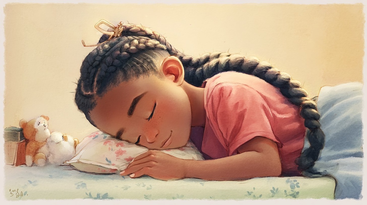 Создано на основе запроса: a 14 age black girl, corn row braids, sleeping at bed, watercolor
