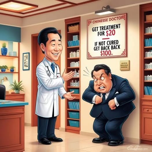 Китайский врач переехал в США, но не смог найти работу в больнице. Тогда он решил открыть собственную небольшую клинику и повесил снаружи табличку с надписью: «Пройдите лечение за 20 долларов — если не вылечитесь, получите 100 долларов обратно!»