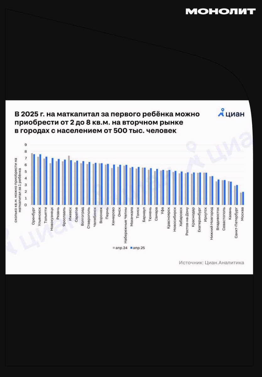 Площадь, которую можно купить за маткапитал в 2025 году В этом году маткапитал на первенца составляет 690,3 тыс. руб. (+9,5% к 2024 году). В крупных городах России этой суммы достаточно для покупки 5,4 кв.м. на вторичке, но в Москве и Санкт-Петербурге это всего 2-3,7 кв.м. Повышение маткапитала позволило немного увеличить покупательскую способность, так как подорожание жилья в большинстве городов оказалось менее заметным. Наиболее сильный рост площади, которую можно купить на сертификат, зафиксирован в Новокузнецке, Кемерово и Ульяновске. #монолит #маткапитал 🧊 Монолит