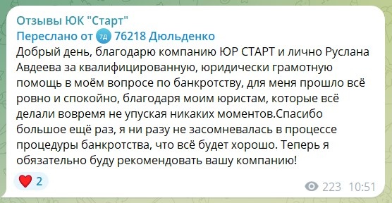 Мы искренне рады, что смогли помочь Вам избавиться от непосильной долговой нагрузки. Спасибо, что выбрали нашу компанию. Мы ценим ваше доверие! 🙏 Желаем Вам финансовой стабильности, успехов и достижения поставленных целей!😊 Узнайте, подходит ли ваша ситуация под условия банкротства, по ссылке 👉 t.me/ruslan_avdeev_bot