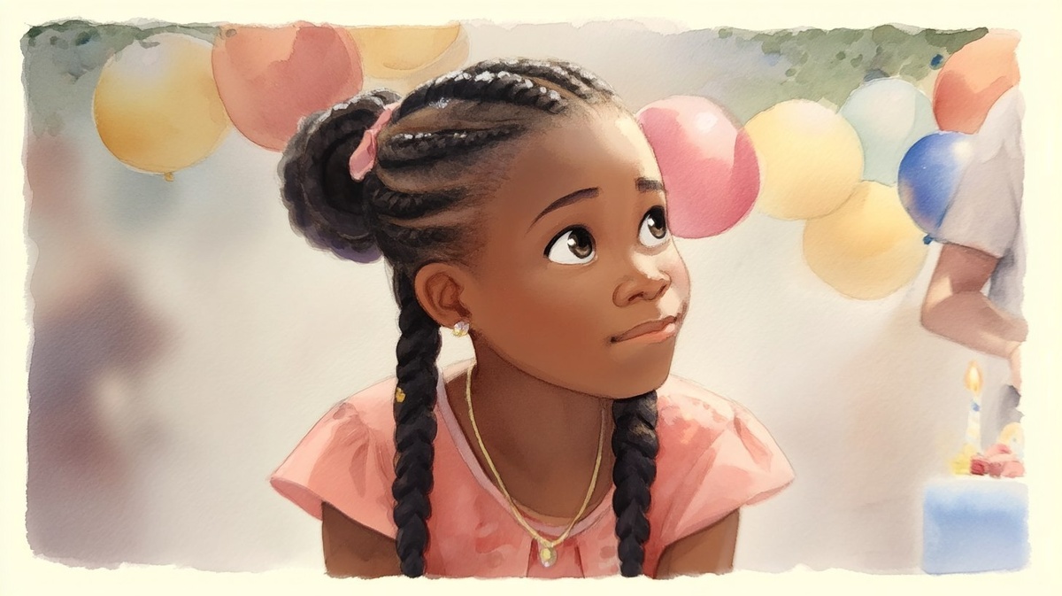 Создано на основе запроса: a 14 age black girl, corn row braids, in a birthday party, watercolor,