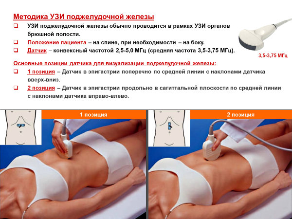 УЗ-картина поджелудочной железы в норме: Поджелудочная железа визуализируется в эпигастральной области. Выше и кпереди визуализируются желудок и печень, сзади визуализируются аорта, верхняя брыжеечная артерия и вена, селезеночная вена, нижняя полая вена, позвоночник. Контуры ровные, капсула не видна. Эхогенность у молодых соответствует печени, но с возрастом повышается. Эхоструктура однородная. Размеры (ПЗР): Головка – 11-30 мм,