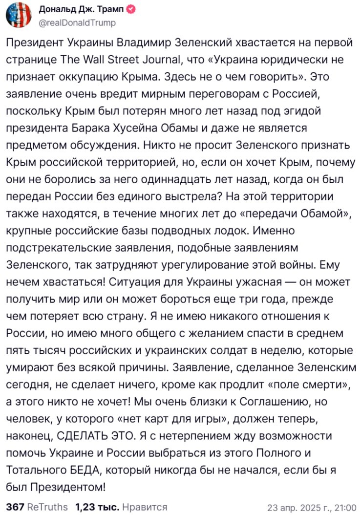 Тут Трамп еще дает шанс "команде Зеленского" одуматься и принять его сторону. Хотя отсутствие информации о "сделке по недрам", которая должна быть согласована и подписана до 26 апреля, говорит о том, что Зеленский саботирует предложения США вполне принципиально.