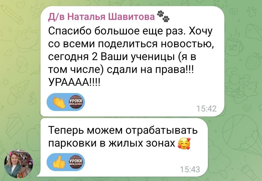 📌Этот комментарий достоин отдельного поста 👍. -------------- Поздравляю!!! 🎉 Это замечательные новости! Вы обе молодцы — ваш упорный труд и ответственный подход принесли результат! Горжусь вами! 😊 Теперь начнётся самое интересное: и парковка во дворах среди реальных машин, и движение по трассе (в т.ч. обгоны), отработка личных маршрутов и т.д и т.п. 🚗💨 Многому ещё нужно научиться. Помните, я всегда на связи! 📞