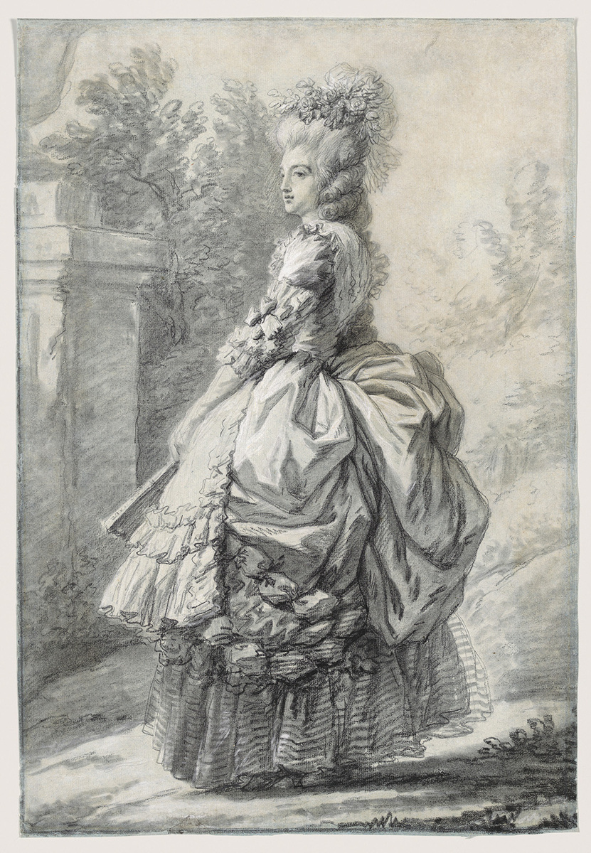 Союз, заключённый между двумя молодыми женщинами — Мари-Элизабет-Луизы Виже-Лебрён (1755–1842), начинающей художницей-портретисткой, и Марией Антуанеттой, королевой Франции австрийского происхождения, — принёс им обоим взаимную выгоду. Королевское покровительство способствовало стремительному росту карьеры Виже-Лебрён, отмеченному членством в Королевской академии и постоянным спросом на её работы. Что касается Марии-Антуанетты, то серия лестных портретов укрепила её репутацию в стране, в которую она переехала после замужества. Хотя Виже-Лебрён написала более двадцати портретов Марии Антуанетты, этот лист является её единственным известным рисунком с изображением королевы. Благодаря своему впечатляющему размеру (58.9 × 40.4 см) и виртуозному обращению с материалами — чёрным мелом, растушеванным и смягченным до серого в некоторых местах, и белым бликам — он имеет все признаки законченной работы, а не этюда для картины. Позируя на открытом воздухе в саду и освещенная тусклым естественным
