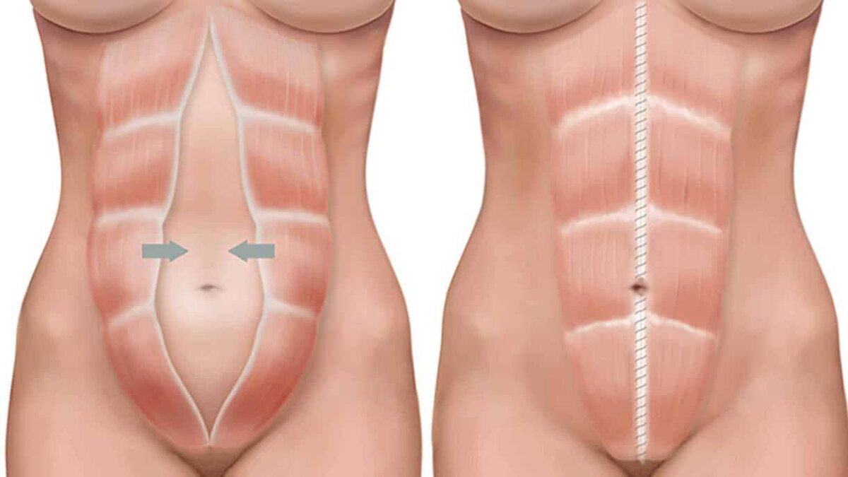 Диастаз - это расхождение прямых мышц живота на различное расстояние из-за того, что белая линия между ними растягивается и истончается.