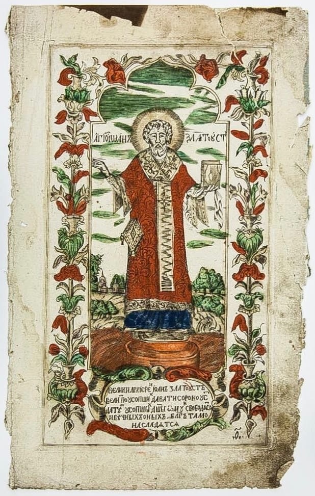 Слева – Гравюра. Ростовая фигура Иоанна Златоуста в растительной рамке и текстом в картуше на нижнем поле, Москва, конец XVII века