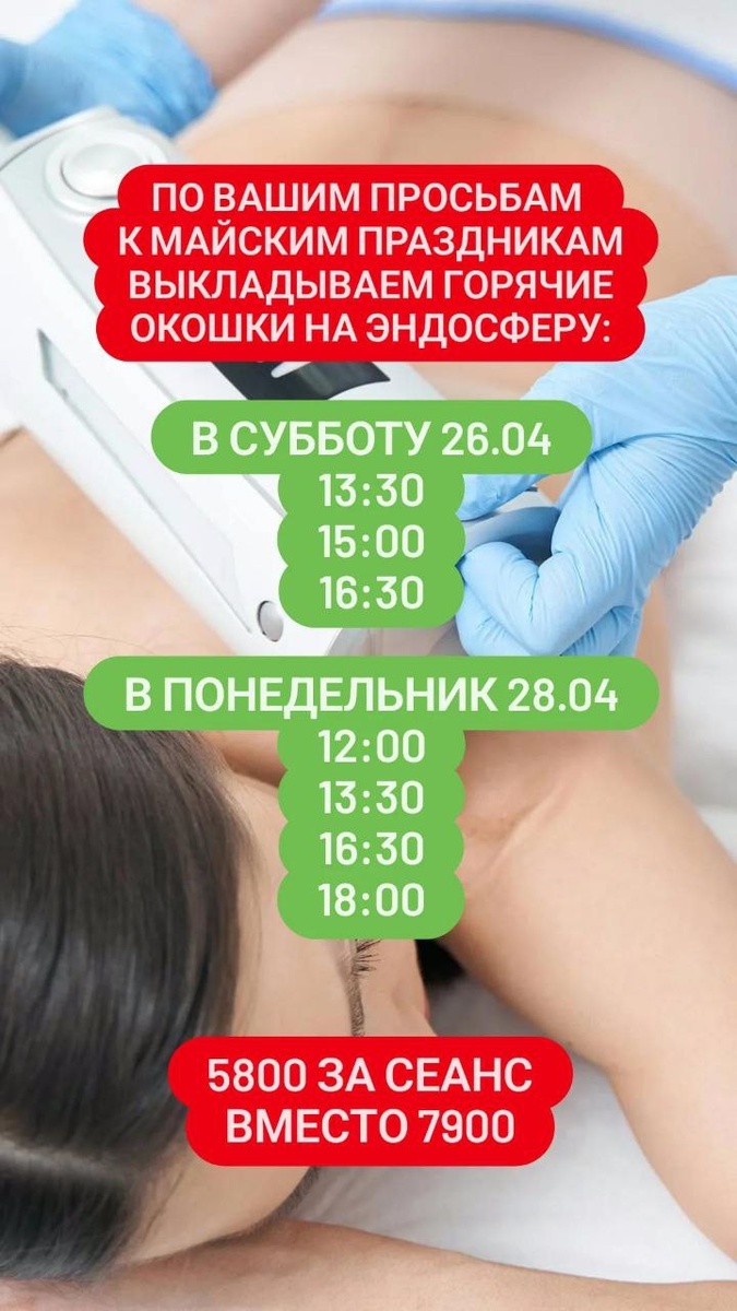 🌟 Вы нас очень просили — мы вас услышали! 🎉 Перед майскими праздниками мы выделили горячие окна для записи на эндосферу! 🔥 Это отличная возможность подготовиться к праздникам и порадовать себя заботой о здоровье и красоте. 💆♀️💖 Поспешите записаться на сеанс, пока есть свободные слоты! Мы предлагаем различные процедуры, которые помогут вам выглядеть и чувствовать себя на все 100🔥 📞 Запись по телефону: 8-966-040-00-54. Не упустите шанс — количество мест ограничено! ✨ С любовью, Команда «Мизклиник»