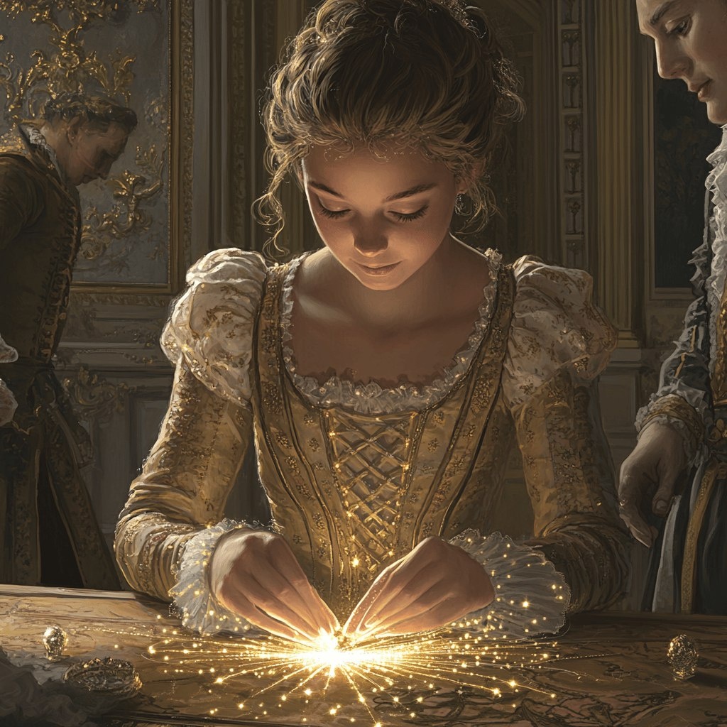 (Франция, 1778 год) Эмили провела рукой по куску шелка, ощущая его холодную гладь. В мастерской мадам Леблан царила полутьма — свечи экономили даже здесь, на парижской улице Сен-Оноре, где богатые дамы заказывали платья, не глядя на ценники. Сирота, взятая в подмастерья из милости, Эмили шила лучше всех, но её имя никогда не звучало в присутствии заказчиц. «Твои руки создают красоту, но твоё лицо её портит», — бросала мадам, указывая на шрам от оспы, пересекавший левую щеку девушки. Всё изменилось в ту ночь, когда небо над Парижем раскололось огненным хвостом. Метеорит рухнул в лес у Версаля, и Эмили, тайком отправившись на поиски осколков, нашла его — камень размером с кулак, испещренный прожилками, будто вплетенными из темноты космоса. В мастерской, растирая метеоритную пыль, она заметила: нитки, смоченные в воде с этой пылью, светились в темноте мягким серебристым сиянием. «Звёздная вышивка», — прошептала она, и сердце забилось как у вора. Когда в ателье пришё