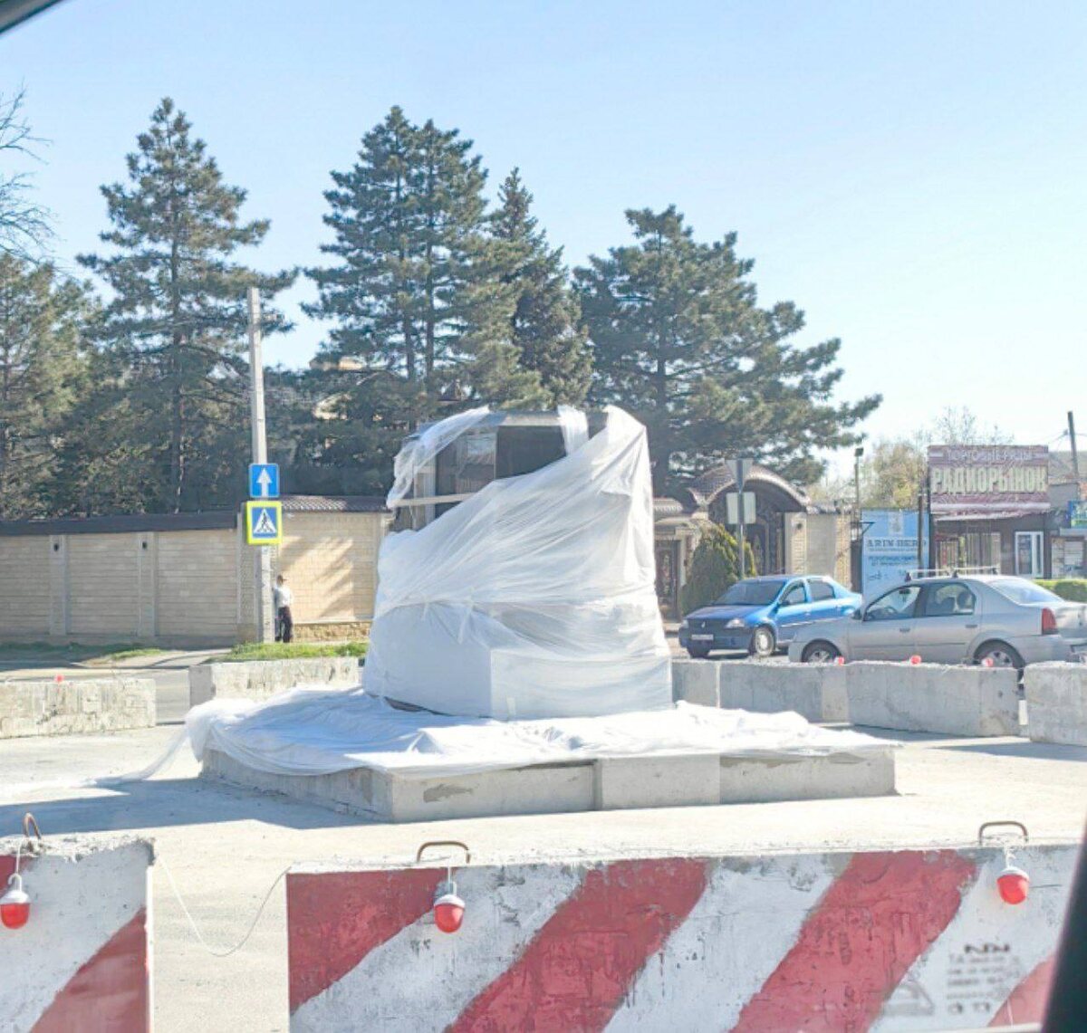 В ответ на пост Оказывается, памятник Гукасу Мадояну поставят посреди проезжей части на Рабочей площади, на островке безопасности в её северной части — видимо, потому что единственное свободное место на пешеходном пространстве площади занимает платный батут (на третьем фото). Честно говоря, это выглядит не особенно удачным решением. Открытие памятника запланировано на 5 мая.