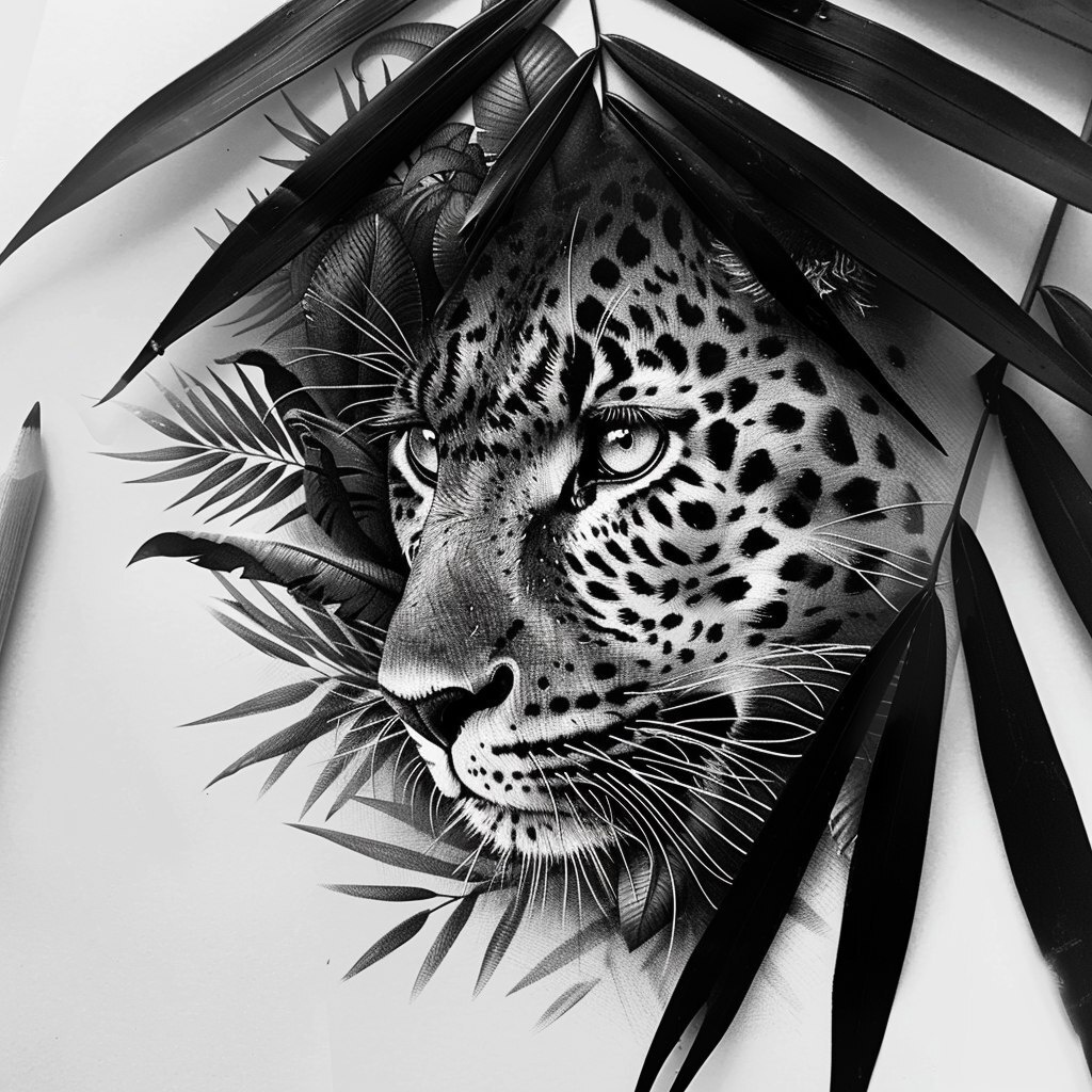 Создано на основе запроса: leopard portrait tattoo design, black and white realistic, jungle dark around the animal, on white paper