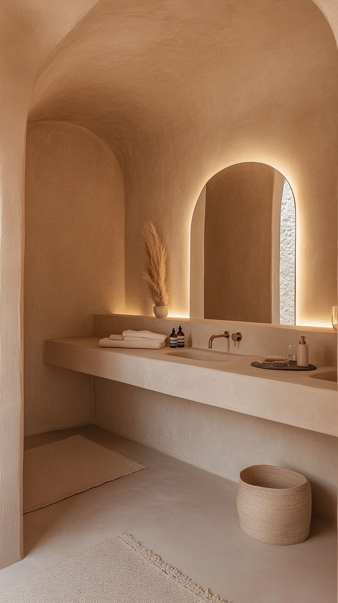 Создано на основе запроса: A contemporary warm-style bathroom with a minimal and elegant design, featuring walls in smooth, light beige microcement or matte resin for a seamless, soft-toned look. A large backlit mirror above a floating vanity in pale wood or beige stone. Fixtures in brushed nickel or soft champagne tones add subtle contrast. Soft, indirect LED lighting integrated into ceiling edges and architectural niches enhances the warm atmosphere. The entire palette is based on light neutrals --- Автоперевод: Современная ванная комната в теплом стиле с минимальным и элегантным дизайном с стенами в гладком, легком бежевом микрокоментам или матовой смоле для бесшовного, мягкого взгляда. Какое твое мнение? 🤔 https://dzen.ru/id/65c0c65c86e4f837c27b24d7 #ИИ #AI #нейросеть #midjourney #art