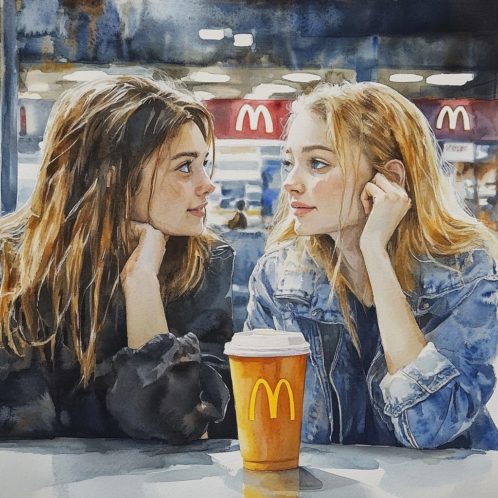 Создано на основе запроса: side view of two girls one is brown haired long nosed with narow eyes other is blond are sitting in McDonalds realistic hyper detailed watercolor painting