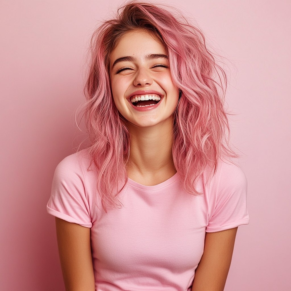 Создано на основе запроса: photo girl LAUGHING IN PINK T-SHIRT, HAIR COLOR WHITE