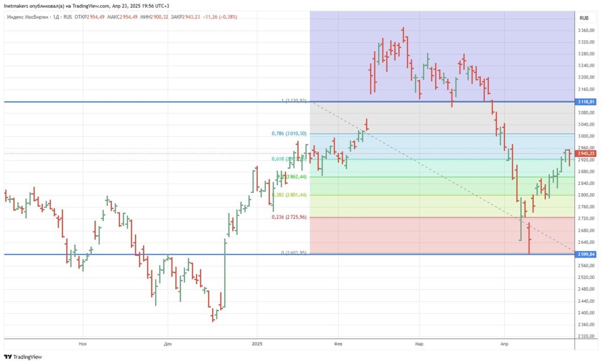 ❗️23 апреля российский фондовый рынок снизился, индекс МосБиржи подешевел на 0,38% до уровня 2943,23. Сегодня у рынка было непростое начало дня, акции упали почти сразу после открытия, так как инвесторы разочаровались тем, что встреча в Лондоне по украинскому урегулированию фактически не состоялась, так как госсекретарь США не приехал, как и остальные чиновники администрации Трампа. Однако, первоначальное падение не привело к обвалу, более того, акции даже выросли, если считать от дневных минимумов. В итоге, хотя негативные технические модели формировались в течении дня, сейчас говорить о развороте российских акций вниз нельзя, поэтому мы ничего не продали. 👉 Наш российский 🇷🇺 портфель — индекс FTinvest.ru прибавил 0,1% и достиг уровня 788,9113, следуйте за нашим индексом FTinvest.ru в закрытом телеграмм-канале. Курс доллара США по данным ЦБ РФ сегодня вырос на 1,1% и составил 82,3637 руб. Нефть WTI ниже на 2,54% до $62,05 за баррель, а Brent на 2,25% и стоит $65,92. Золото с