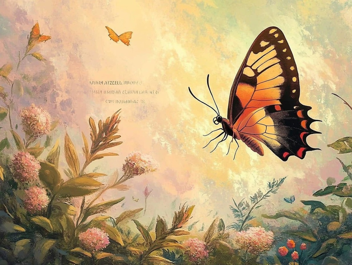 Создано на основе запроса: use this art style, A Common Jezebel Butterfly in a garden, it is a morning scene