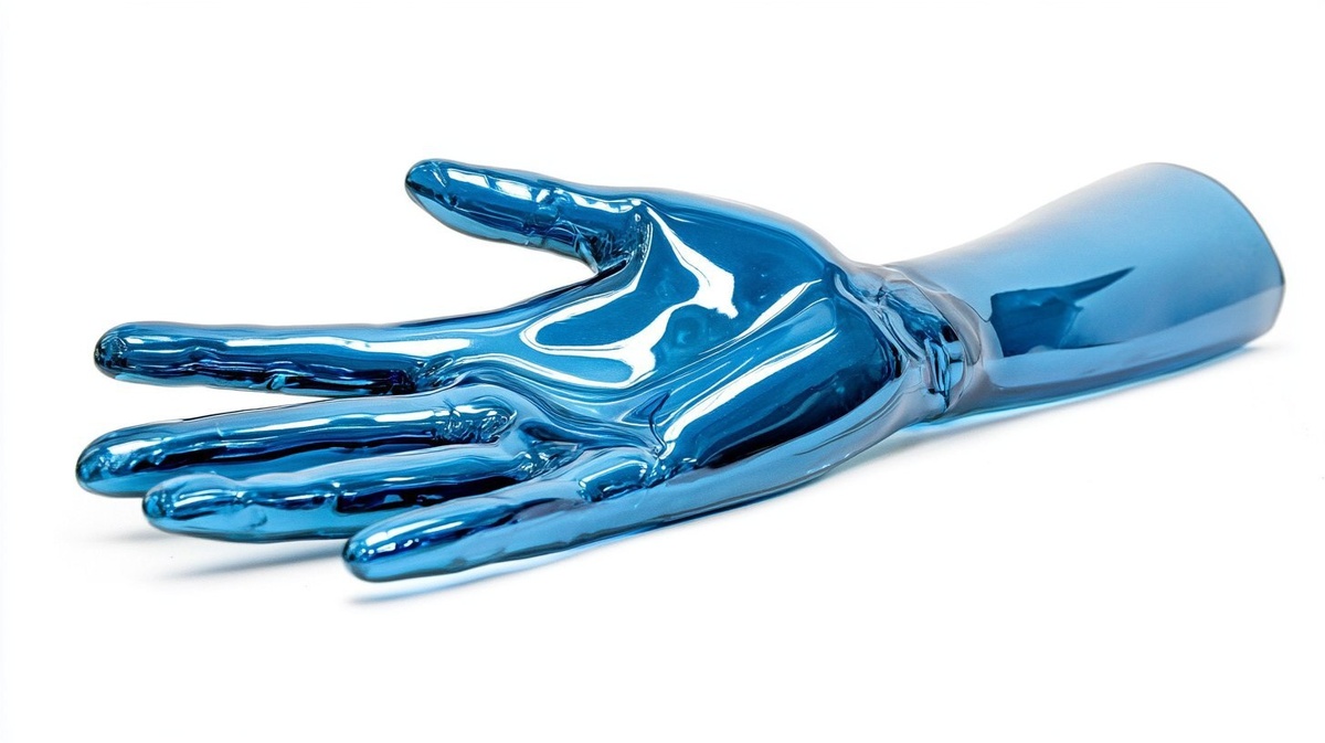 Создано на основе запроса: a plastic hand wearing a tight fitting glossy blue latext medical glove outstretched and isolated on white